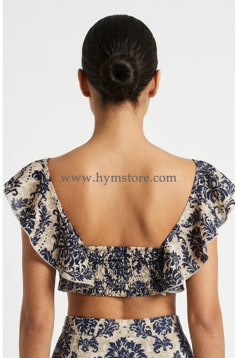 Hermosa blusa corta de hombros descubiertos, fruncida en la espalda y con hermoso estampado bohemio.