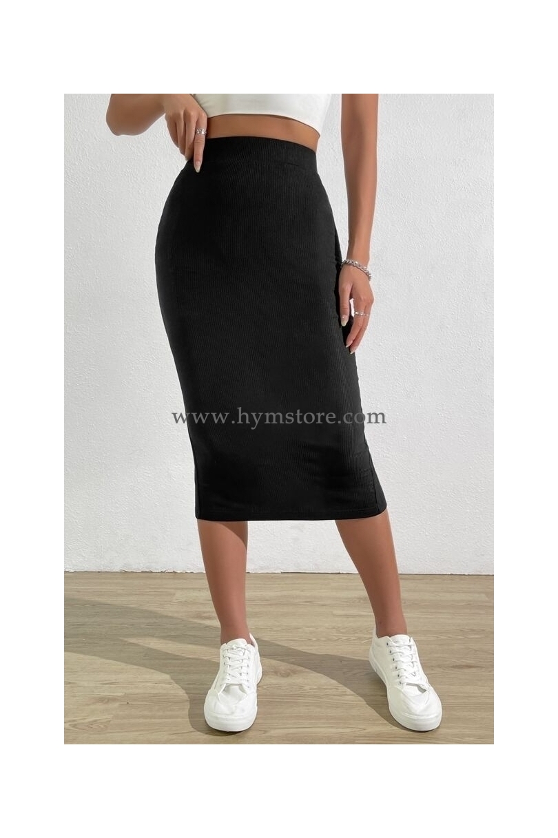 Falda lápiz con elástico en la cintura y abertura atrás.