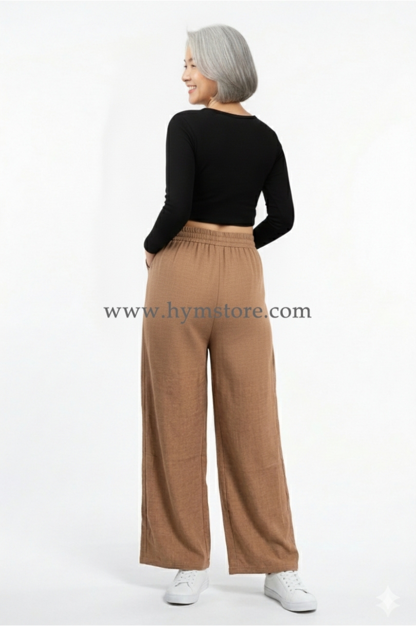 Pantalón de pierna ancha, pretina ancha frontal para estilizar tu figura y cintura elastizada en la parte de atrás.